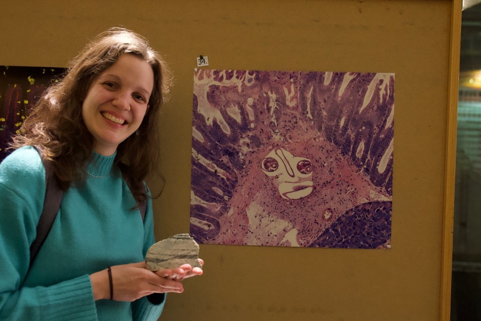 A People’s Choice Award crowned the evening, honouring the piece that best embodied the spirit of “science-meets-art.” This year’s winner, Susan Westfall, PhD, a postdoctoral fellow in Professor Irah King’s lab, presented a striking image, obtained during her routine tissue analysis, of an intestinal helminth embedded inside the muscle layer of the intestine. The ensemble looks like a smiley face. The piece sparked conversation, delight, and reflection, drawing praise from attendees and from Angela Palmer herself, who offered her an ancient rock she herself uses for her sculptures as a symbolic prize.